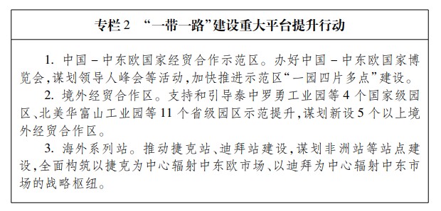 二、主要任务 (一)聚焦协同发展,完善商务发展空间布局。 1.加快打造“一带一路”重要枢纽。拓展“一带一路”沿线市场,升级“一带一路”浙商行活动。深化国际产能合作,拓展与“一带一路”沿线国家和地区产业链供应链合作,持续推进境外经贸合作区建设,加快构建境内境外园区链式合作体系。支持宁波舟山港加大“一带一路”沿线航线开发力度,拓展海上丝绸之路网络。全力打造国际航空货运高地,国际航空货运基本成网。加快发展多式联运,全面提升服务能力。大力发展丝路电子商务。 2.大力开拓国内市场。依托长江经济带发展战略,开展东西部产业协作,打通东西部生产资料和商品流通渠道,形成互联互通共享的国内大市场。深入实施长三角一体化发展战略,加快推进长三角区域市场一体化,逐步统一市场规则和监管机制,打破区域市场壁垒。支持杭州经济技术开发区与苏州工业园区、张江高科技园区等平台联动发展,深化上海漕河泾新兴技术开发区海宁分区、中新嘉善现代产业园等园区共建,推动长三角产业链跨区域协同发展,培育世界级先进制造业集群。统筹优化商品流通基础设施布局,畅通长三角一体化市场网络。 3.以“四大建设”优化省内布局。大力推进浙江自贸区、开发区等高能级平台建设,引导大项目、好项目向大湾区集聚,培育一批具有竞争力的现代化产业集群。深入践行绿水青山就是金山银山理念,推进园区有机更新。纵深推进义甬舟开放大通道建设,推动宁波舟山港国际枢纽功能前移,打通对内开放融合的西延通道。建设现代化国际化大都市区,提升国际化教育、医疗卫生、社区、文化服务等配套水平,成为国际人才、资本、信息等高端要素的重要流量入口。