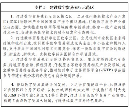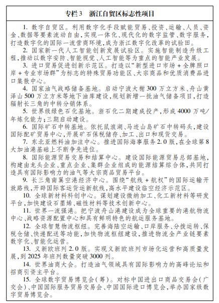 (二)高标准建设浙江自贸区,打造油气自贸区、数字自贸区和枢纽自贸区。 1.大力推进制度创新。推进贸易和投资自由便利先行先试,探索建立特殊综合保税区,逐步放宽油气产业、数字经济、生命健康、新材料和文化娱乐等领域投资和经营限制。推进跨境资金流动自由便利先行先试,加快推进本外币合一账户试点,积极推进跨境人民币结算,创新跨境外汇结算模式,建立普惠金融服务体系。推进运输来往自由便利先行先试,加强海港、陆港、空港、信息港“四港”联动,形成与贸易自由化相匹配的物流体系。推进人员进出自由便利先行先试,开展国际人才管理改革。 2.推动四大片区差异化特色化发展。对标国际最高水平经贸规则,建立与五大功能定位相适应的制度体系。打造以油气为核心的大宗商品全球资源配置基地,开展油气储备体制改革试点,做大做强以油品、液化天然气(LNG)、液化石油气(LPG)为主导的能源进口、转口和国内贸易,提升大宗商品价格全球话语权,打造液化天然气登陆中心。打造新型国际贸易中心,创新发展跨境电子商务、数字服务贸易、市场采购等新型贸易方式。打造国际航运和物流枢纽,加快宁波舟山港一体化和义新欧班列2.0版建设,开辟国际运输开放新路线,建设全球智能物流枢纽。打造数字经济发展示范区,深化金融科技应用创新,探索数字经济领域国际规则。打造先进制造业集聚区,大力发展生命健康、新材料、智能制造等产业集群,超前布局发展人工智能、生物工程、第三代半导体、类脑芯片、柔性电子和量子信息等未来产业。 3.强化内外合作联动发展。推动浙江自贸区与杭州城西科创大走廊、宁波甬江科创大走廊等科创平台联动,推进之江实验室、阿里达摩院、国科大杭州高等研究院等研发机构建设。强化与沪苏皖自贸区特别是上海临港新片区的联动发展,加快跨港区供油、期现一体化油气交易中心建设,推进上海港、连云港、宁波舟山港协作发展,打造世界级港口集群。持续探索共建自由贸易港。加强自贸区与区域全面经济伙伴关系(RCEP)等区域自由贸易协定联动,探索构建适应高水平对外开放的规则体系和制度框架。