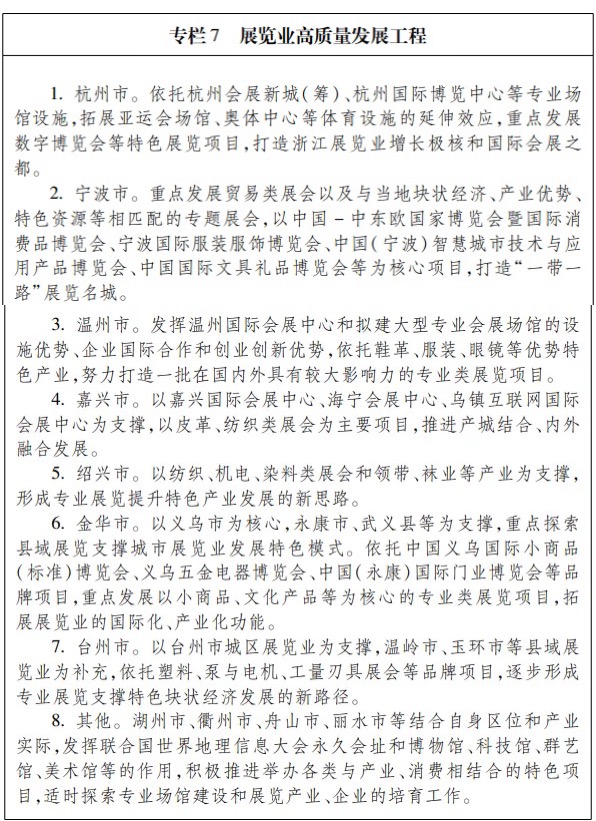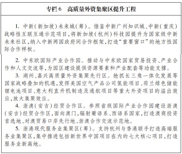2.践行“地瓜理论”开展国际投资。深入实践“地瓜理论”,启动浙江本土民营跨国公司“丝路领航”三年行动计划。支持本土民营跨国公司并购海外技术、品牌、渠道等优质资源,引导高端产业环节回归浙江,做强企业本土总部,建设一批兼具创新能力、成长性和国际影响力的世界级跨国公司。健全以备案为主的境外投资管理制度。 3.畅通国际高端要素流动。深入贯彻外商投资信息报告制度。全面实施外商投资准入前国民待遇加负面清单管理制度,深化金融、医疗、教育、健康等领域对外开放。加快打造全球人才蓄水池,大力引进国际一流的战略科技领军人才和高水平创新团队,打通科研人才与产业人才双向流通渠道。稳妥推动数据要素可交易、可流通,探索跨境数据安全有序流动。 4.实现更高层次跳出浙江发展浙江。健全境外投资政策和服务体系,发挥境外投资服务联盟作用,深入开展“丝路护航”行动。推动资产评估、法律服务、会计服务等生产性服务业国际化发展,创新“走出去”金融产品与服务,加大对境外投资合作的信用保险支持。创新发展对外承包工程,鼓励联盟拓市和投建营一体化,积极参与第三方市场合作,带动装备、技术、标准和服务走出去。充分发挥海外浙商作用,支持温州建设世界华商综合发展试验区、金华建设中非文化合作交流示范区、丽水建设浙江(青田)华侨经济文化合作试验区。 (七)提升开放平台能级,构建高水平开放平台体系。 1.探索构建中欧经济循环示范区。做大做强国际产业合作园,通过国内外产能合作、产业联动,打造国内国际市场循环支点。推动义新欧班列提质增效,不断提升开行规模和国际影响力,进一步发挥市场化机制,深化平台整合,完善集货网络,加强线路拓展,扩大返程进口。深化国际标准对接,在有条件的地区率先引入欧洲在医疗药品、旅游娱乐、体育养老等产业的管理标准,并实现资格互认。 2.搭建地方经贸合作平台。高质量利用双多边自由贸易协定,在全省范围内开展宣传、培训等普及教育工作,提高自由贸易协定利用率。加强RCEP研究分析,开展专项培训,健全经济联系网络,探索打造RCEP地方开放型经济合作试验区。加强对全面与进步跨太平洋伙伴关系协定(CPTPP)的跟踪研究。加强与美国、德国、日本等经贸往来,做好浙非、浙新双边合作。 3.推进开发区创新发展。深化开发区整合提升,完善开发区考核评价体系,推进开发区争先进位和警示退出机制,实现1—2家国家级经济技术开发区进入全国前10位。大力推动国际产业合作园建设,以全球精准合作为重点,实施产业集群培育升级行动。全面推广开发区产业链“链长制”,推动试点全覆盖。创新开发区体制机制,探索法定机构改革。深化开发区“亩均论英雄”改革。推动美丽园区建设。 4.提升会展平台能级。高水平举办中国浙江投资贸易洽谈会、世界互联网大会、世界油商大会、联合国世界地理信息大会等。办好传统市场、新兴市场国际性展会,引进若干行业影响力强、带动效应显著的国际知名品牌展会。支持会展业与商业、旅游、文化、体育等产业联动发展,大力发展新兴会展业态。优化展馆布局,支持杭州、宁波等地推进展馆建设。